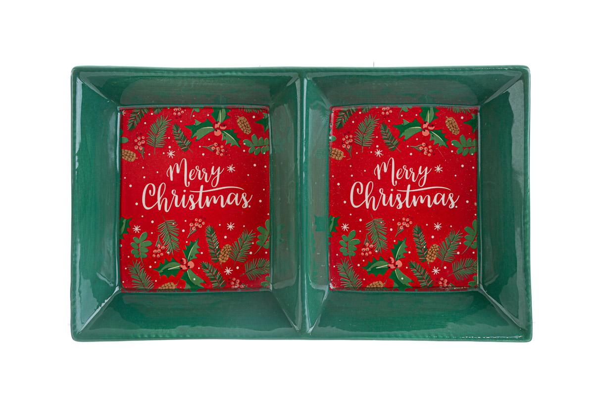Design Festivo e Accattivante: Questo vassoio รจ un inno al Natale! Presenta due scomparti distinti, ciascuno con un vivace inserto rosso decorato con agrifoglio, pigne e fiocchi di neve, su cui spicca la calorosa scritta “Merry Christmas”. Il bordo verde smeraldo lucido completa il design con un tocco di raffinatezza tradizionale.