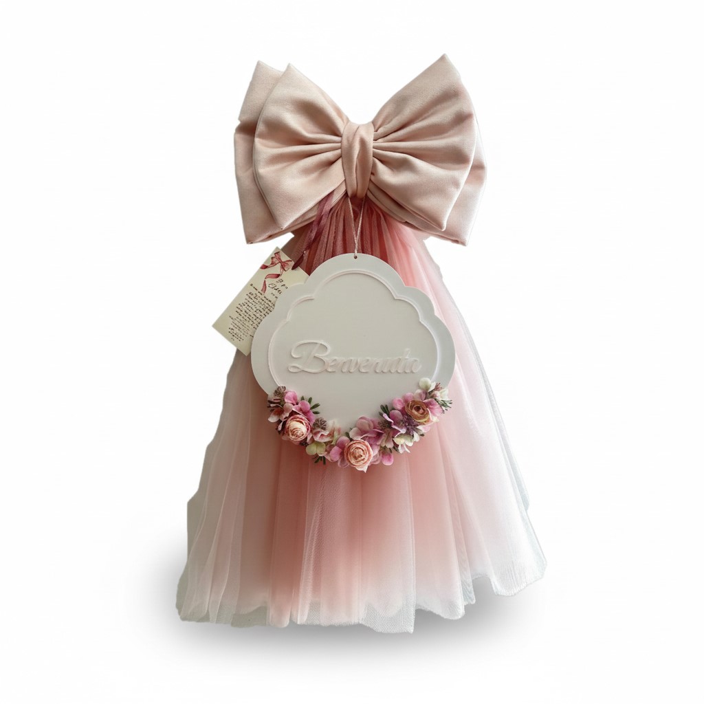 L’attesa è finita, ed è giunto il momento di accogliere una nuova vita con la grazia che merita. Il Fiocco Nascita Madame Fioccò è una creazione artigianale che sembra uscita da una fiaba, perfetta per celebrare l’arrivo della tua piccola principessa.