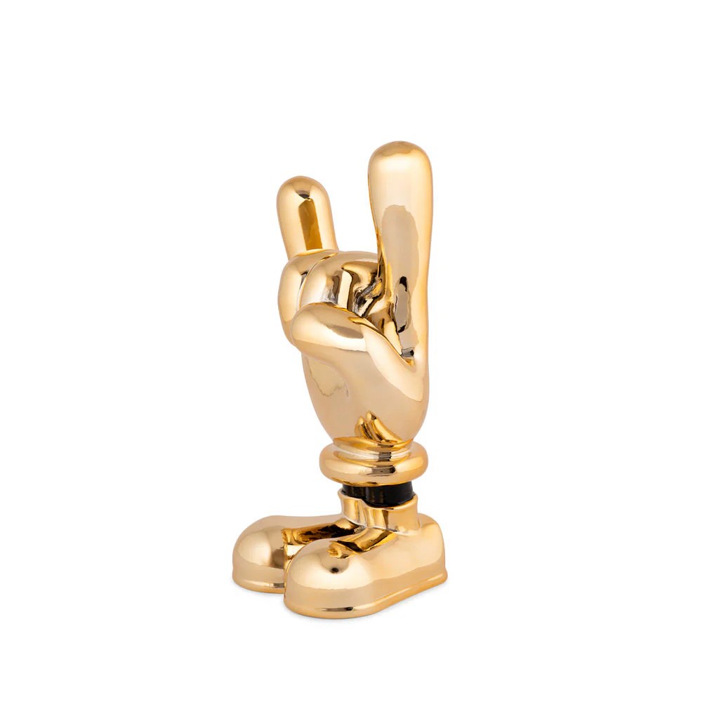 Un portafortuna contemporaneo che, con i suoi scarponcini e la finitura brillante, allontana la sfortuna e accende lo spazio con la sua energia.