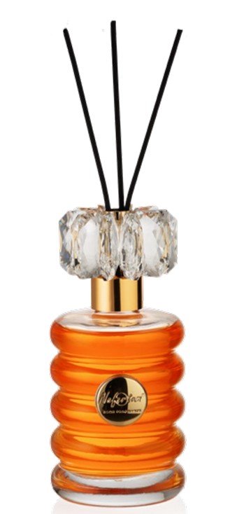 Struttura del Flacone: Il corpo del diffusore è realizzato in vetro trasparente di alta qualità, caratterizzato da un’originale silhouette a nelli sovrapposti che crea un piacevole ritmo visivo e tattile.