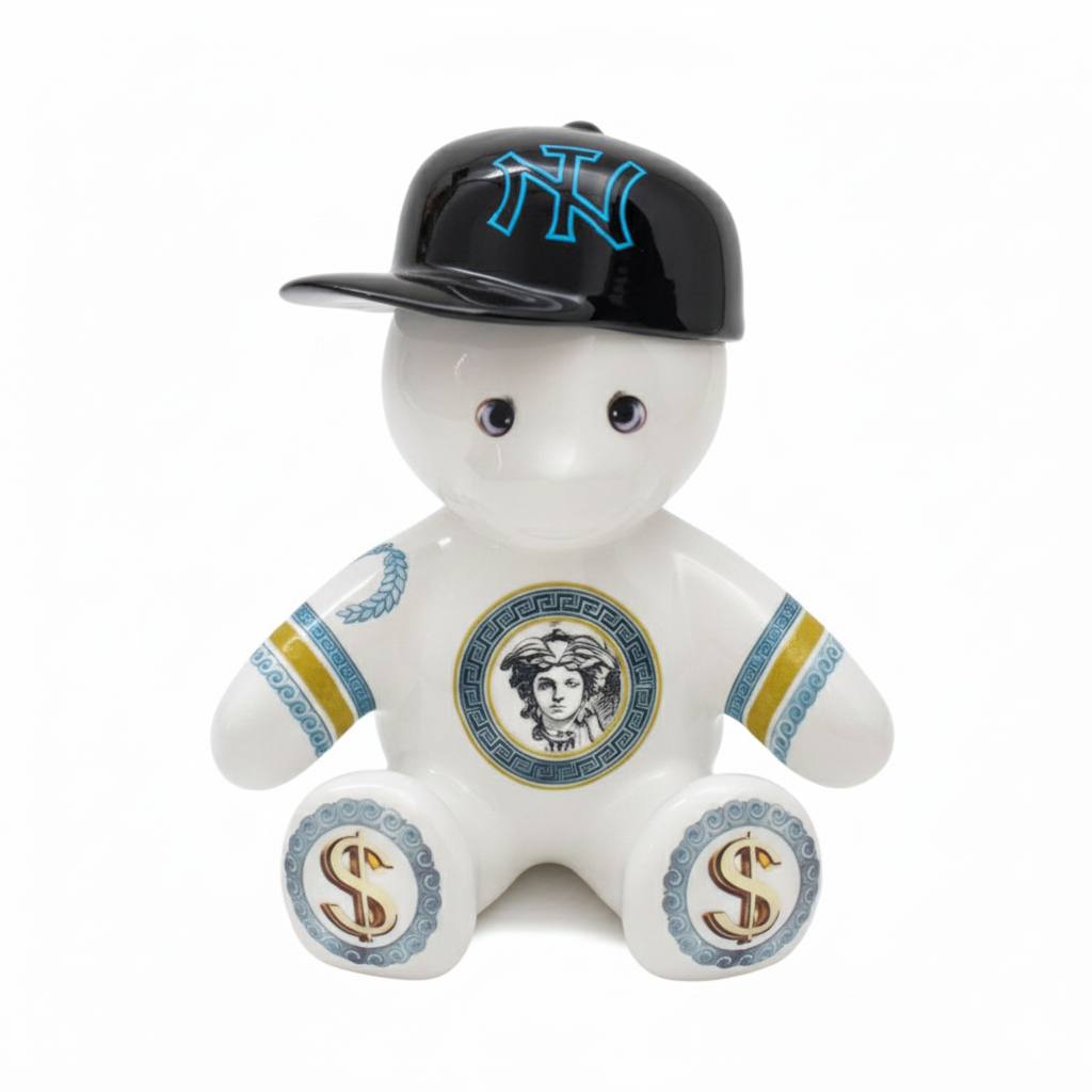 Look Ibrido: Realizzato in ceramica bianca lucida, la forma classica dell’orsetto è impreziosita da dettagli inaspettati e di forte impatto.