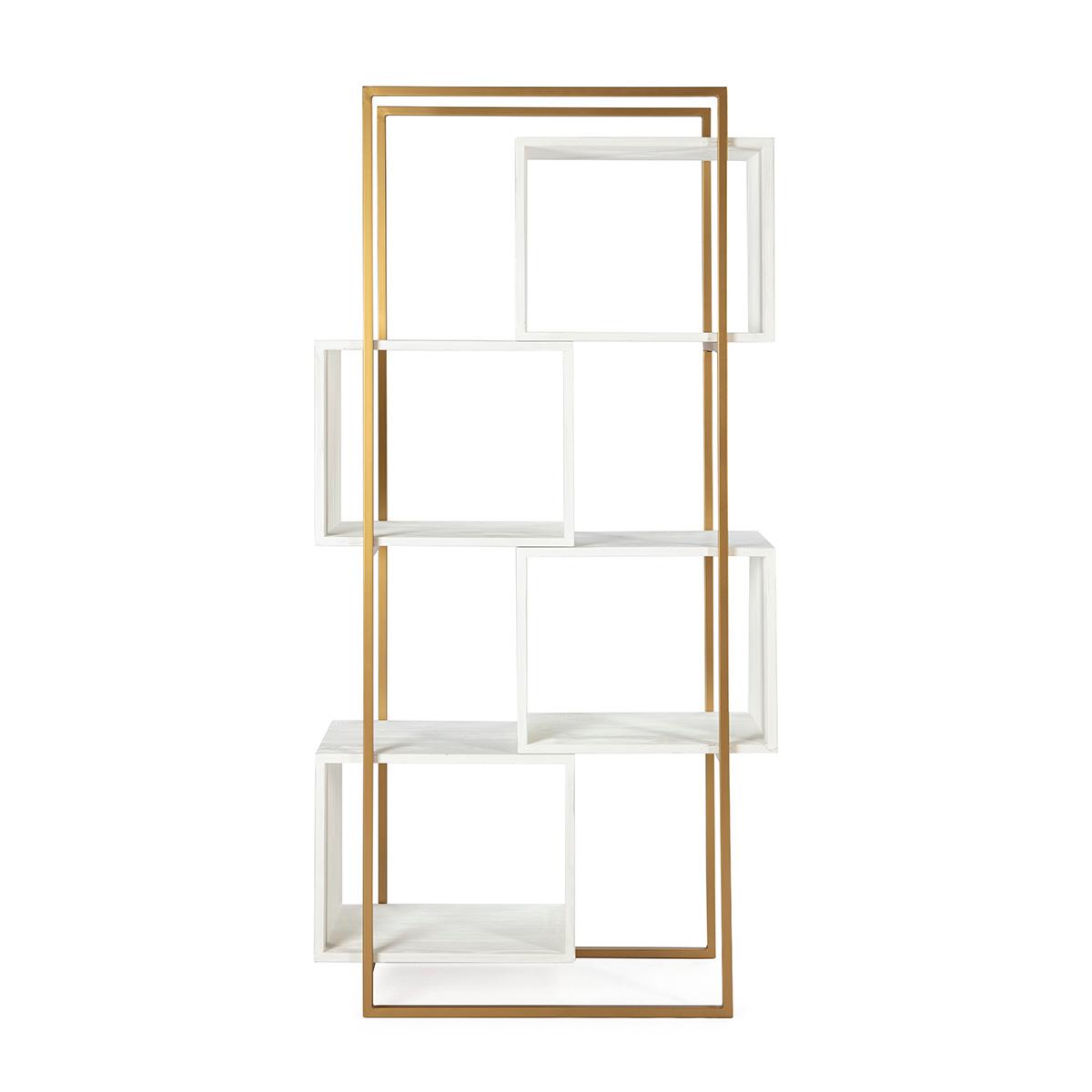 Un’affascinante libreria in stile vintage di ispirazione Art Déco, con struttura in ferro color oro abbinata a cubi in legno di abete bianco.